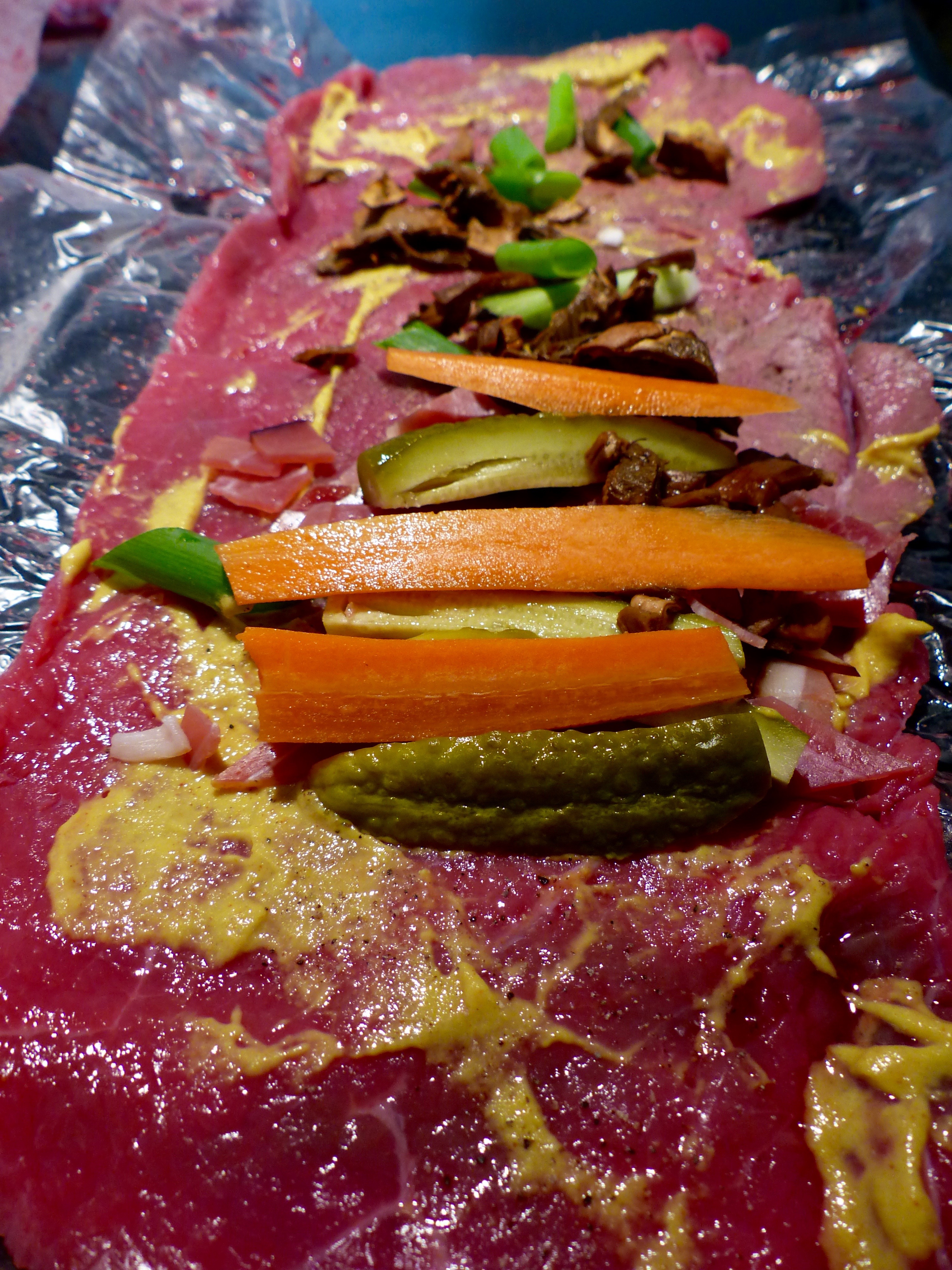Die Füllung der Roulade 4. November 2015 3000 × 4000 Steinpilzroulade mit Koriander-Möhrchen Streifen von Möhren, Gürkchen, Frühlingszwiebeln auf der ausgebreiteten Roulade