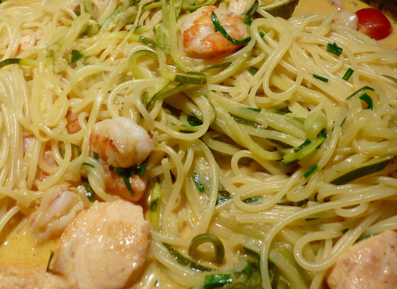 P1020691 24. Februar 2016 2368 × 1727 Zucchinispaghetti mit Hummersauce Zucchini- und richtige Spaghetti in der Pfanne vereinen