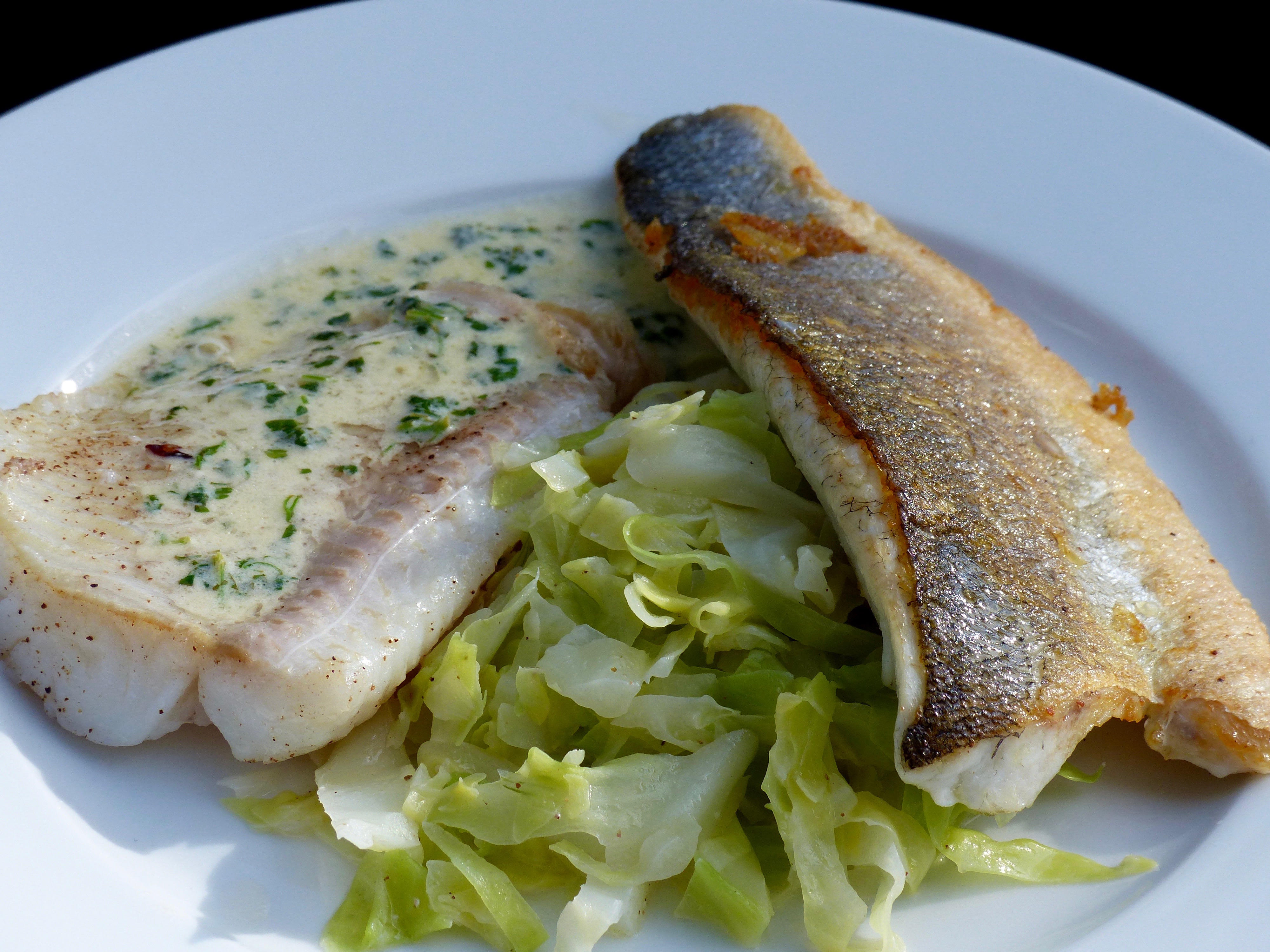 Spitzkohl it Wolfsbarsch und schwarzem Heilbutt 19. Juni 2016 4000 × 3000 Wolfsbarsch und schwarzer Heilbutt mit feinen Beilagen