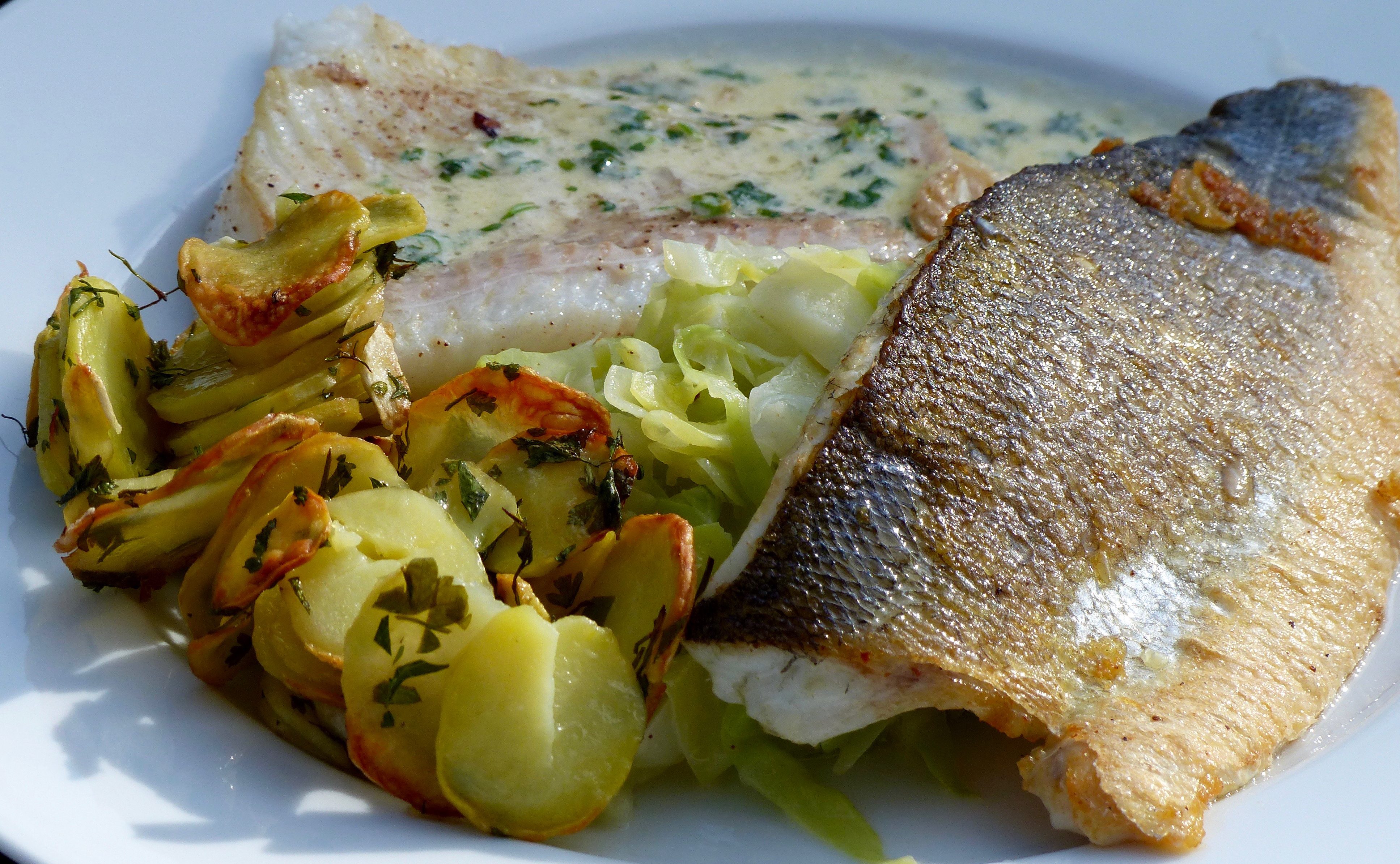 Fischgericht mit Spitzkohl, Kerbelsoße und Muffin-Kartöffelchen 19. Juni 2016 3870 × 2390 Wolfsbarsch und schwarzer Heilbutt mit feinen Beilagen Wolfsbarsch, Heilbutt mit Kerbelsoße und Muffin-Kartöffelchen