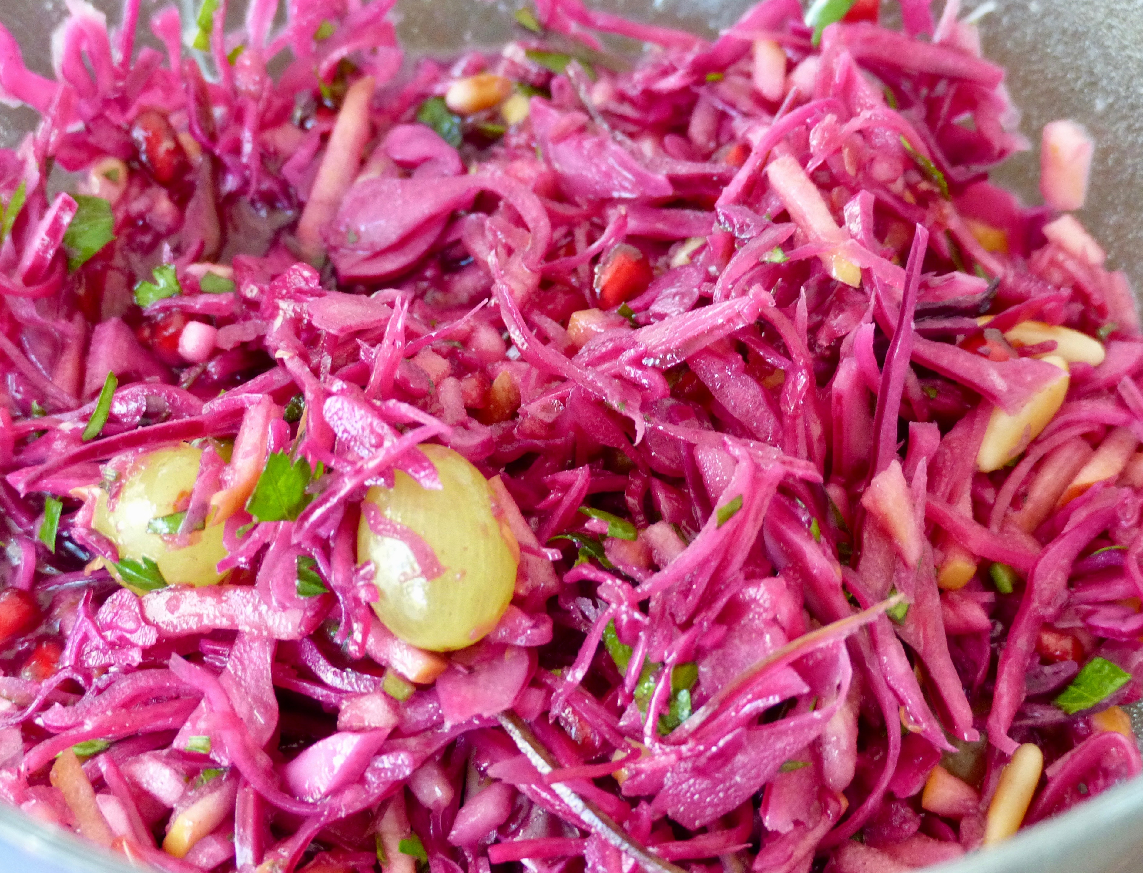 Herbstlicher Rotkohlsalat 30. Oktober 2016 3770 × 2878 Pfannen-Gyros mit rotem Krautsalat mit Trauben, Pinien- und Granatapfelkernen