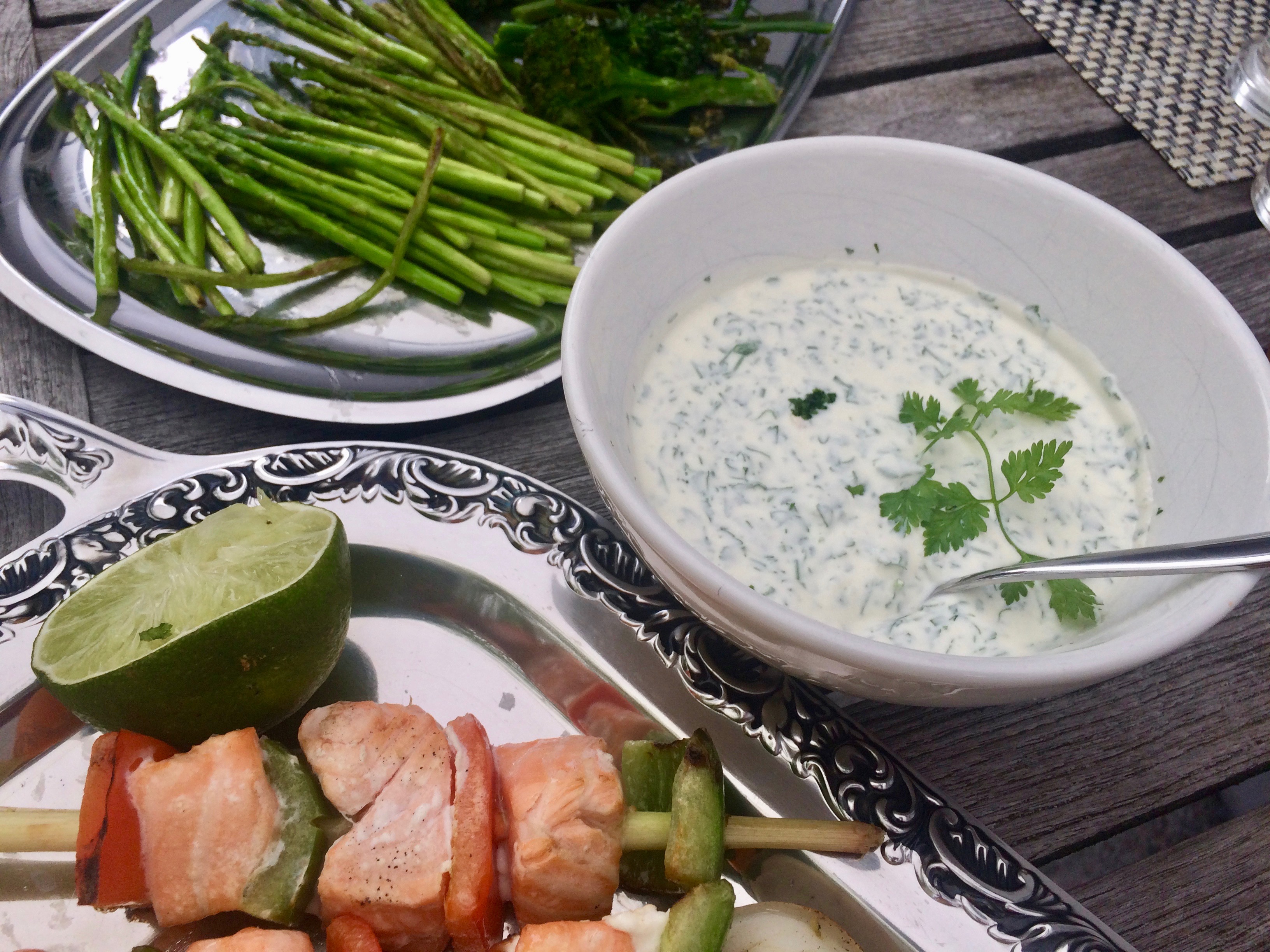 Fischspieße2 1. Juli 2017 3264 × 2448 Still alive – still cooking Fischspieße mit Kerbelsoße, wildem Brokkoli und Spargelspitzen