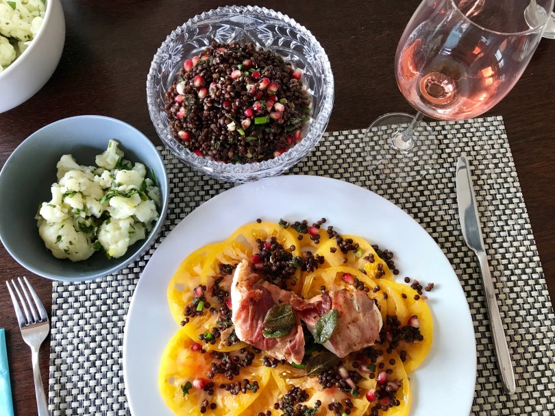 Das Sommergericht mit Blumenkohlsalat 15. Juli 2017 4032 × 3024 Seeteufel auf Ananastomate und Linsensalat
