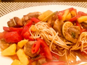 Dazu gab es ein paar dünne Thai-Nudeln, Reis wäre sicher auch gegangen.
