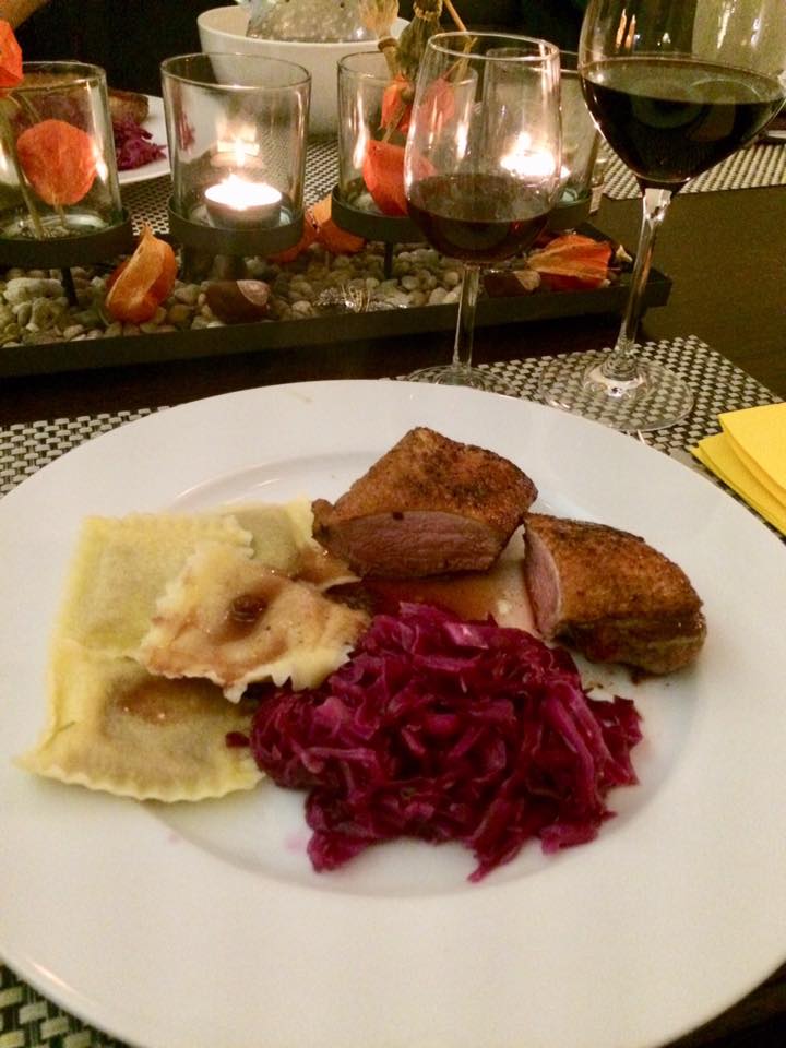 Ente, roter Spitzkohl und gefüllte Teigtaschen