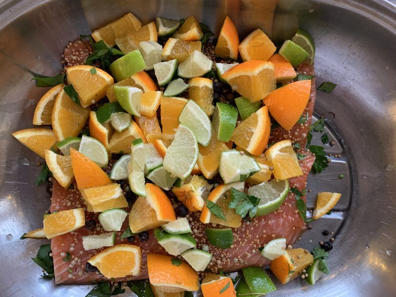 Graved Lachs 3 22. Dezember 2019 4032 × 3024 Vorbereitungen für Weihnachten laufen Mit Stücken von Orangen und Limetten versehen, je 1 Espressotasse Salz und Zucker darüber gestreut