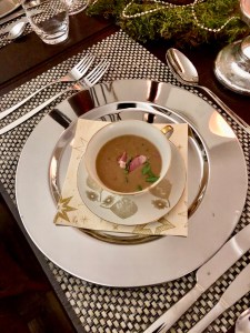 Zunächst ein Maronensüppchen, abgeschmeckt mit weißem Portwein, als Einlage Streifen von einer geräucherten Entenbrust, serviert in Sammeltässchen von der Oma.