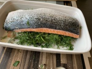 Die Fischhälften in einer tiefen Form übereinander gelegt, abgedeckt und ein wenig beschwert in den Kühlschrank. Nach 12 Stunden einmal rumdrehen.