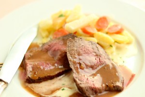 Hm, ein wenig verschätzt hab ich mich: Das Fleisch brauchte länger, als ich dachte. Doch mein Hunger und das Kartoffelragout ließen jetzt nicht mehr zu, dass es nach Erreichen der Kerntemparatur ausgiebig ruhen konnte. Machte aber nichts, es war zart, hat kaum Fleischsaft verloren beim Anschneiden und benötigte nur noch ein wenig Salz und schwarzen Pfeffer. Gut, als Soßenjunkie musste noch ein wenig Soße aus Bratensaft, Madeira, Roséwein, Gemüsebrühe des Ragouts, Fond etc. an die Hüfte (an meine und an die des argentinischen Rinds).