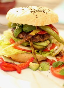 Alle Zutaten gut vermengen, bis die Zeit des Bulgurs (s. o. : 20 Minuten) gekommen ist. Diesen zunächst mit der Gabel auflockern, Tomatenmischung unterheben und weitere 2o Minuten ziehen lassen (Timer auf 10 Minuten stellen, denn dann geht es ans Fleisch).