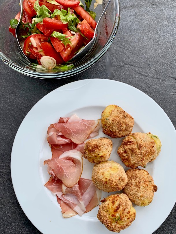 Kartoffelbällchen mit Käse, Schinken und Tomatensalat 12. Juni 2019 2598 × 3454 Kartoffelbällchen mit Käse, Schinken und Tomatensalat