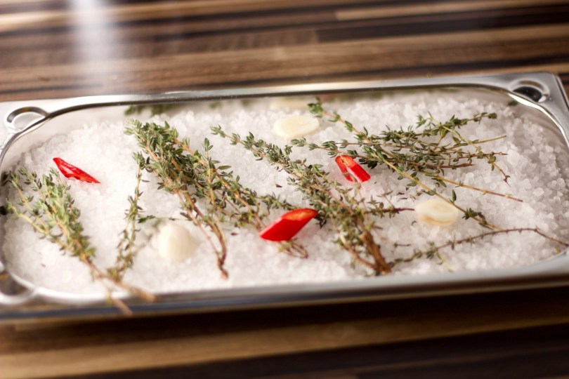 Salzbett 3. Februar 2019 5184 × 3456 Salzbett Das Salzbett mit Thymianzweigen, Knoblauch-Scheibchen und Chili-Ringen